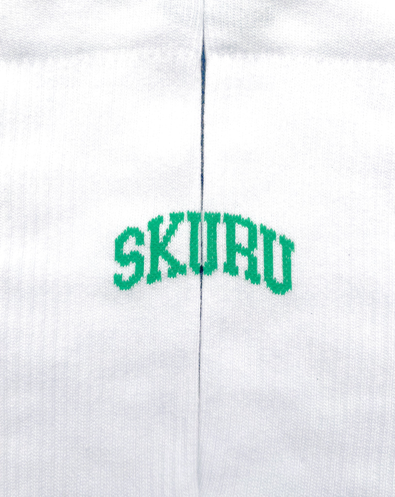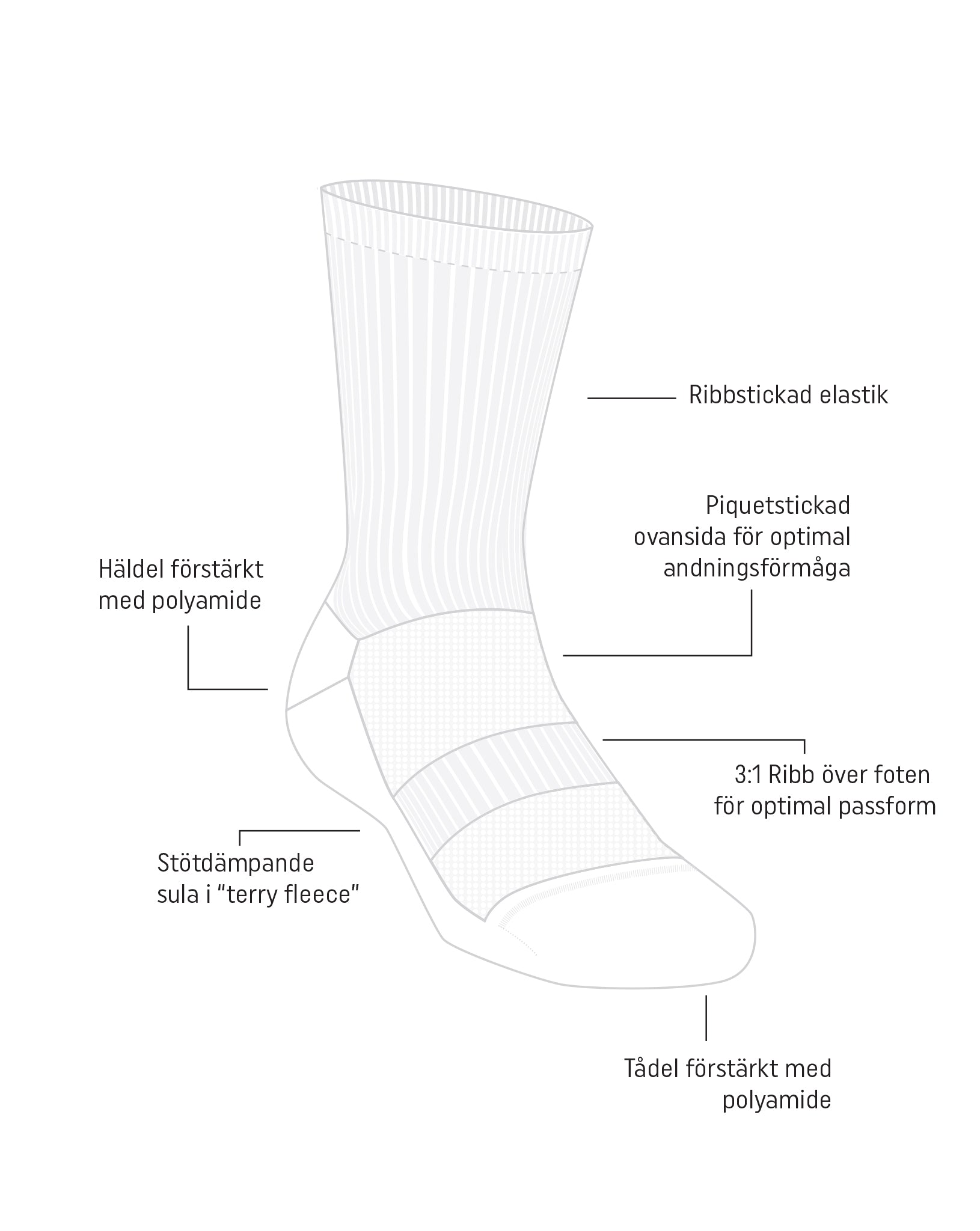 Strumpan är ribbstickad med SKURU-logga baktill, och en tunn pique-stickad överdel för optimal andningsförmåga. Under foten har den en tjockare terry-fleece-konstruktion som ger extra stöd och komfort i skon. Tå och här är förstärkta med polyamid för ökad hållbarhet och slitstyrka.